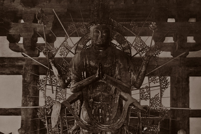 この呪符の中央におられる仏は、絶望や恐怖に苦しむ人々を救う第三の目を持ち、手に持った羂索(けんじゃく)で良縁や必要な縁は救済し結びつけ、悪縁は縛り付けて離しません。